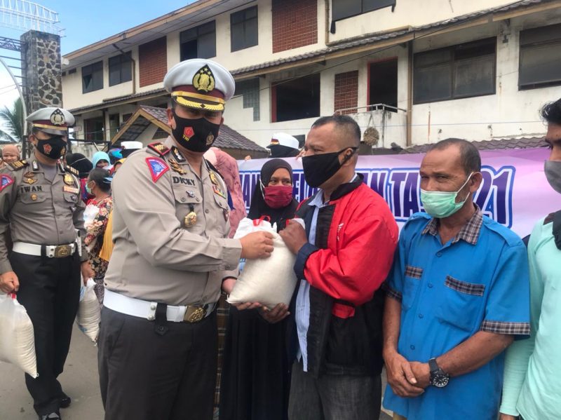 Banda Aceh – Dalam rangka Operasi Keselamatan Seulawah Tahun 2021, Direktorat Lalulintas (Ditlantas) Polda Aceh, Rabu (14/04/2021) membagikan sembako kepada para pedagang kurang mampu di Pasar Peunayong, Kota Banda Aceh.