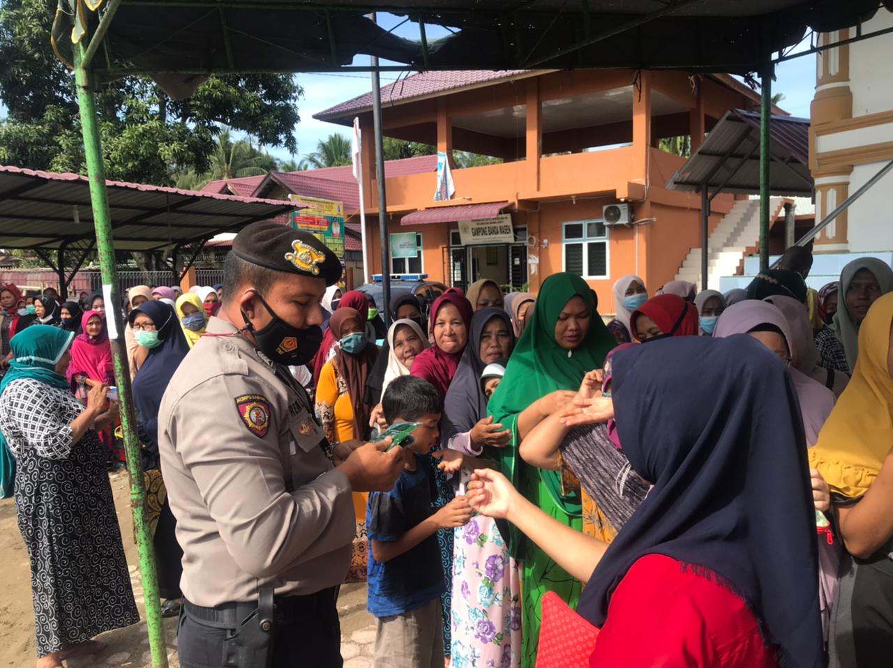 LHOKSEUMAWE – Personel Polres Lhokseumawe mengamankan pelaksanaan Pasar Murah dalam rangka menyambut bulan suci Ramadhan di kantor Keuchik Banda Masen, Kecamatan Banda Sakti, Kota Lhokseumawe, Kamis (8/4/2021).