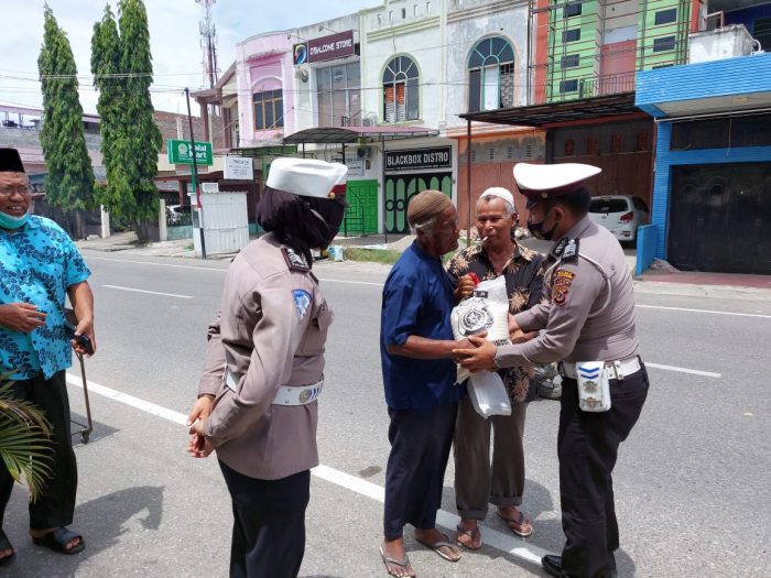 LHOKSEUMAWE – Sat Lantas Polres Lhokseumawe membagikan bantuan sembilan bahan pokok (sembako) kepada warga kurang mampu di wilayah hukum Polres Lhokseumawe, Jumat (2/4/2021)