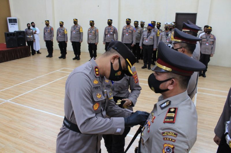 LHOKSEUMAWE- Polres Lhokseumawe menggelar upacara serah terima jabatan Kasat Intelkam, Kasat Sabhara, Kapolsek Sawang dan Kapolsek Simpang Kramat yang berlangsung di gedung serbaguna Wira Satya Polres Lhokseumawe, Jum’at pagi ( 16/04/2021).