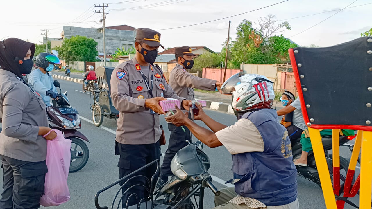 LHOKSEUMAWE – Personel Polres Lhokseumawe melakukan pembagian takjil kepada masyarakat pengguna jalan raya, kegiatan tersebut berlangsung di jalan Negara Medan-Banda Aceh depan Mapolres Lhokseumawe, Rabu (28/4/2021).