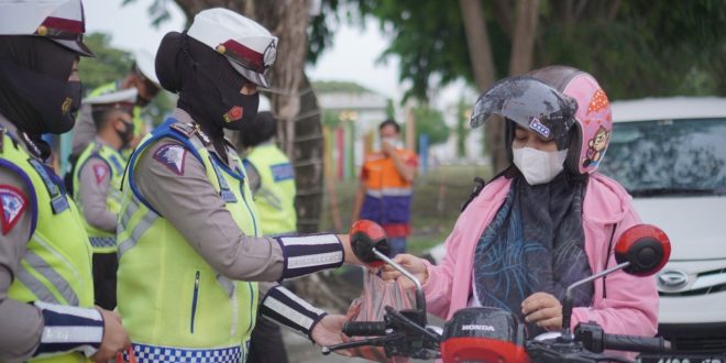 Banda Aceh – Sejumlah Personel Ditlantas Polda Aceh termasuk Polwan membagi takjil buka puasa pada hari pertama puasa di bulan suci Ramadhan 1442 H.