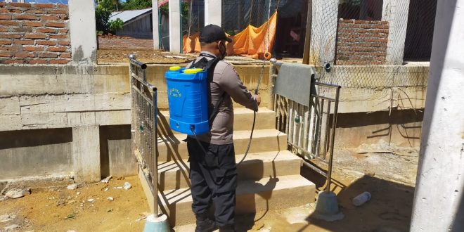 LHOKSEUMAWE – Polsek Samudera melakukan penyemprotan disinfektan di Kampung tangguh Gampong Asan, Kecamatan Samudera, Aceh Utara, wilayah hukum Polres Lhokseumawe, Senin (26/4/2021).