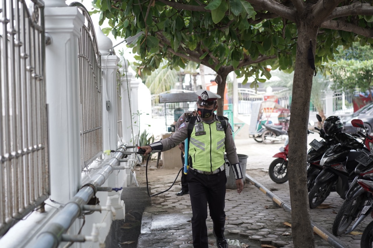 LOKSEUMAWE – Puluhan personel Sat Lantas Polres Lhokseumawe ke Masjid Jamik, Kecamatan Banda Sakti, Kota Lhokseumawe, Rabu (14/4/2021), kedatangan personel ini ternyata untuk menyemprot cairan disinfektan.