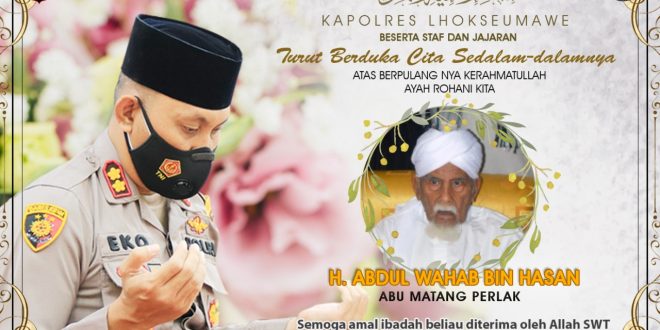 “Kapolres Lhokseumawe beserta staf dan seluruh jajaran turut berduka cita sedalam-dalamnya atas berpulang ke Rahmatullah Ayah Rohani Kita H Abdul Wahab bin Hasan (Abu Matang Perlak),” ujar Kapolres Lhokseumawe.