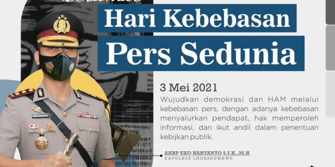 LHOKSEUMAWE – Kapolres Lhokseumawe AKBP Eko Hartanto SIK MH mengucapkan selamat atas Hari Pers Sedunia yang jatuh pada tanggal 3 Mei 2021.
