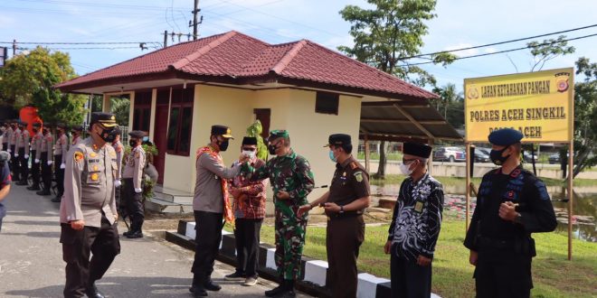 BANDA ACEH – Kunjungan Kerja Kapolda Aceh Irjen Pol. Drs. Wahyu Widada, M. Phil, ke Polres Aceh Singkil disambut dengan hormat jajar sejumlah personel di penjagaan Mapolres Aceh Singkil, Sabtu (29/5/21) pagi.