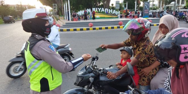 LHOKSEUMAWE – Dalam rangka memutus mata rantai penyebaran Covid-19 dan Ops Ketupat Seulawah 2021, Polantas Lhokseumawe membagikan masker kepada pengguna jalan serta mengimbau untuk tidak mudik, kegiatan tersebut berlangsung di depan Taman Riyadhah Kecamatan Banda Sakti Kota Lhokseumawe, Minggu (9/5/2021).