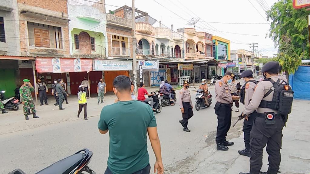 LHOKSEUMAWE – Polres Lhokseumawe bersama tim gabungan melakukan pendisiplinan protokol kesehatan (prokes) kepada masyarakat, di seputaran pasar inpres, Kecamatan Banda Sakti, Kota Lhokseumawe, Sabtu (15/5/2021).