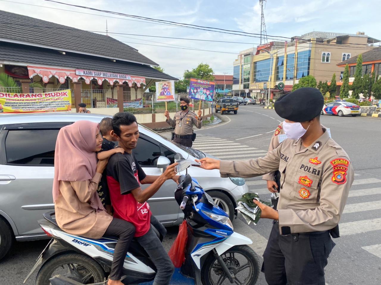 LHOKSEUMAWE – Tim Unit Reaksi Cepat (URC) Siagam Sat Sabhara Polres Lhokseumawe melaksanakan kegiatan sosialisasi Adaptasi Kebiasaan Baru (AKB) dan membagikan masker di kawasan simpang Jam, Kecamatan Banda Sakti, Kota Lhokseumawe, Selasa (4/5/2021).