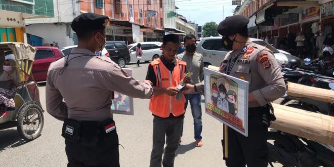 LHOKSEUMAWE – Tim Unit Reaksi Cepat (URC) Siagam Sat Sabhara Polres Lhokseumawe melaksanakan kegiatan sosialisasi Adaptasi Kebiasaan Baru (AKB) dan protokol kesehatan di pusat keramaian di wilayah Kota Lhokseumawe, Selasa (4/5/2021).