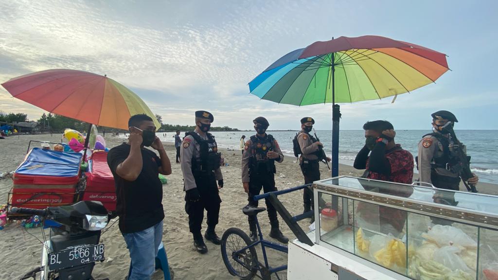 LHOKSEUMAWE – Tim Unit Reaksi Cepat (URC) Siagam Polres Lhokseumawe melaksanakan patroli dan memantau protokol kesehatan (prokes) di lokasi wisata pantai Ujong Blang, Kecamatan Banda Sakti, Kota Lhokseumawe, Sabtu (22/5/2021).