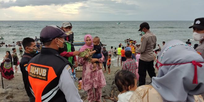 LHOKSEUMAWE – Personel gabungan melaksakan patroli di lokasi wisata pantai Ujong Blang, Kecamatan Banda Sakti, Kota Lhokseumawe, dalam kegiatan itu petugas juga membagikan masker kepada pengunjung, Sabtu (15/5/2021).