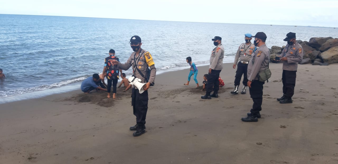 LHOKSEUMAWE – Personel Polsek Banda Sakti melaksakan patroli di kawasan wisata Pantai Ujong Blang, Kecamatan Banda Sakti, Kota Lhokseumawe, Jumat (14/5/2021), dalam kegiatan itu personel mengimbau pengunjung utamakan keselamatan.