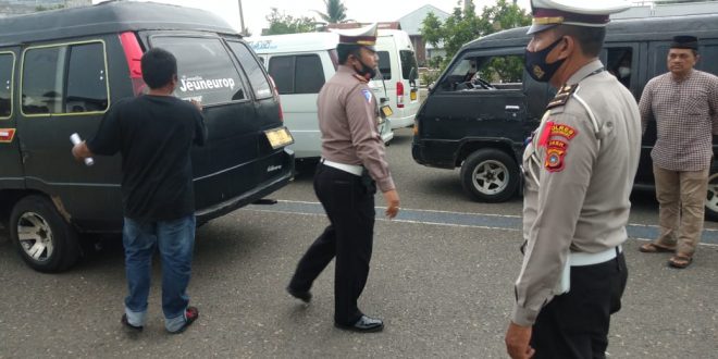 LHOKSEUMAWE – Jajaran Polres Lhokseumawe mulai melakukan penyekatan kendaraan umum membawa penumpang dalam razia di depan Mapolres Lhokseumawe, Kamis (6/5/2021). Dalam kegiatan itu, sejumlah kendaraan dari arah Medan menuju Banda Aceh diperintahkan putar balik.