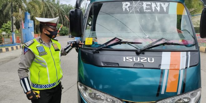 BANDA ACEH – Di perbatasan lintas Aceh-Sumut kendaraan yang lewat ke Aceh yang sudah diperiksa petugas di pos penyekatan operasi ketupat seulawah 2021, diberikan stiker dari Ditlantas Polda Aceh.