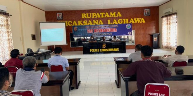 LHOKSEUMAWE – Guna meningkatkan Sumber Daya Manusia (SDM), personel Sat Res Narkoba Polres Lhokseumawe dibekali pelatihan fungsi teknis, kegiatan tersebut berlangsung di Aula Rupatama Wicaksana Laghawa Polres Lhokseumawe, Minggu (9/5/2021).