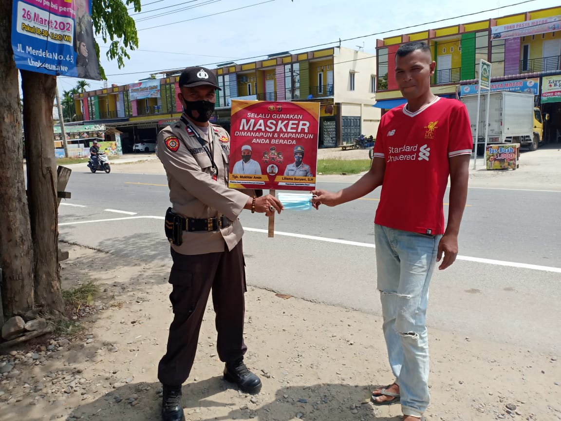 LHOKSEUMAWE – Personil Polsek Syamtalira Bayu, Polres Lhokseumawe melaksanakan sosialisasi protokol kesehatan (Prokes) disertai alat peraga di Gampong Beunot, Kec. Syamtalira Bayu, Aceh Utara. Dalam kegiatan itu, personil juga membagikan masker, Rabu (5/5/2021).