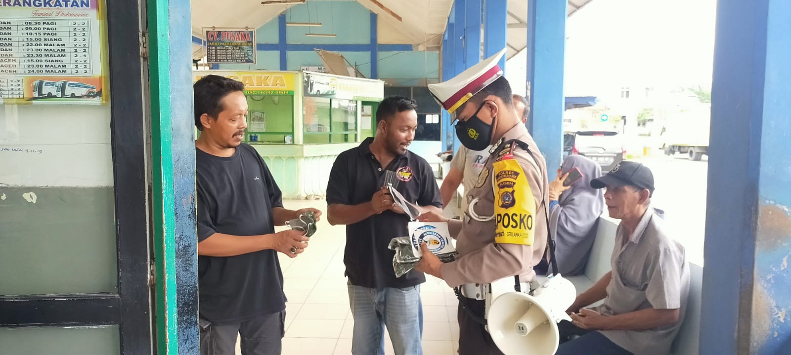 LHOKSEUMAWE – Sat Lantas Polres Lhokseumawe melakukan kegiatan pembagian masker kepada masyarakat di terminal angkutan umum L300 Kota Lhokseumawe,Rabu (19/5/2021).