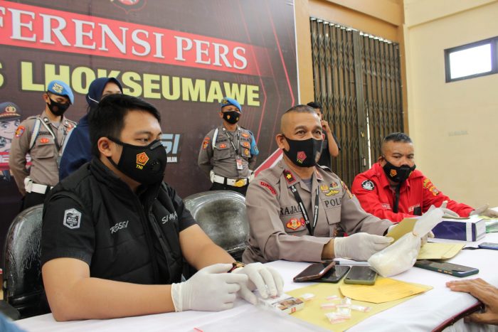 Kapolres Lhokseumawe AKBP Eko Hartanto SIK MH melalui Wakapolres Kompol Raja Gunawan saat konferensi pers di gedung serbaguna Wira Satya Mapolres Lhokseumawe mengatakan, dalam pengungkapan kasus ini personel Sat Resnarkoba Polres Lhokseumawe juga berhasil membekuk satu tersangka.