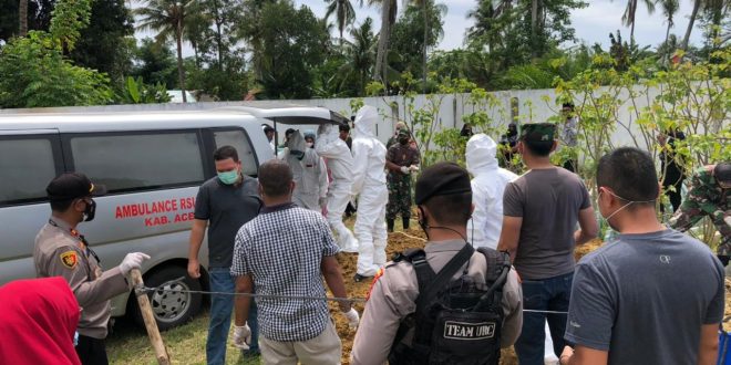 LHOKSEUMAWE – Personel Polres Lhokseumawe melakukan pengamanan proses pemakaman pasien Covid-19 di Gampong Uteun Bayi, Kecamatan Banda Sakti, Kota Lhokseumawe, Minggu (23/5/2021).