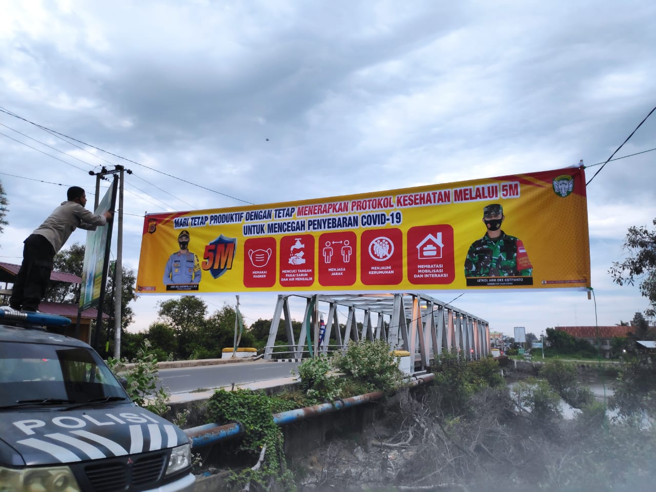 “Spanduk ini bertuliskan 5M, yaitu himbauan kepada masyarakat nagar memakai masker, mencuci tangan, menjaga jarak, menjauhi kerumunan serta membatasi mobilisasi dan interaksi,” ujarnya.
