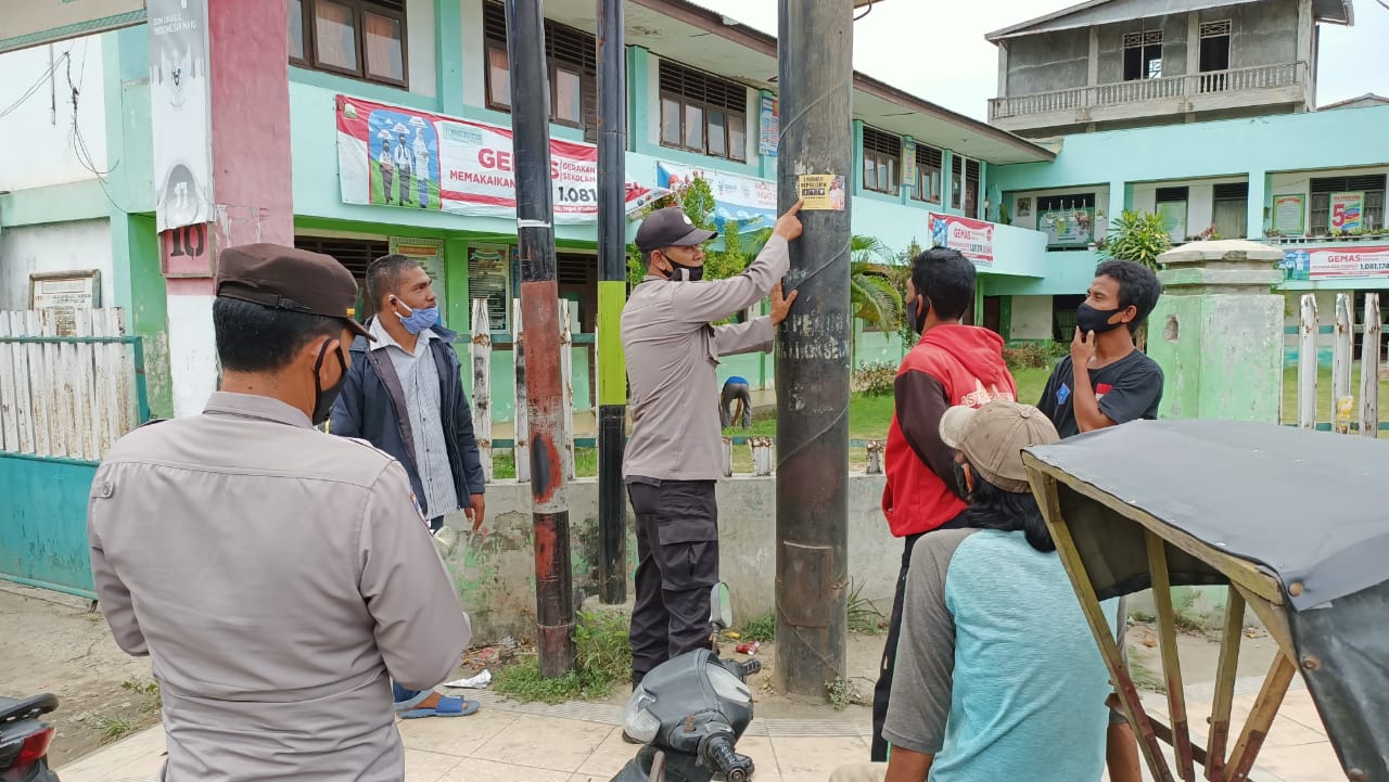 LHOKSEUMAWE – Sat Binmas Polres Lhokseumawe menempelkan stiker dan sosialisasi call center Hallo Polri 110 di wilayah hukum Polres Lhokseumawe, Rabu (19/5/2021).