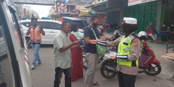 LHOKSEUMAWE – Dalam rangka mencegah dan memutus mata rantai penyebaran Covid-19, Sat Lantas Polres Lhokseumawe membagikan 100 masker kepada masyarakat di Jalan Sukaramai, Kecamatan Banda Sakti, Kota Lhokseumawe, Senin (17/5/2021).