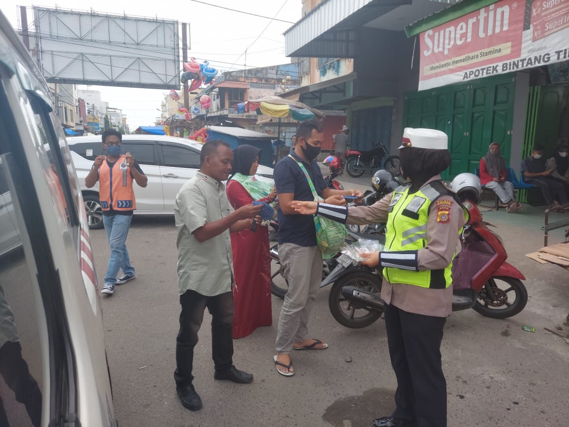 LHOKSEUMAWE – Dalam rangka mencegah dan memutus mata rantai penyebaran Covid-19, Sat Lantas Polres Lhokseumawe membagikan 100 masker kepada masyarakat di Jalan Sukaramai, Kecamatan Banda Sakti, Kota Lhokseumawe, Senin (17/5/2021).