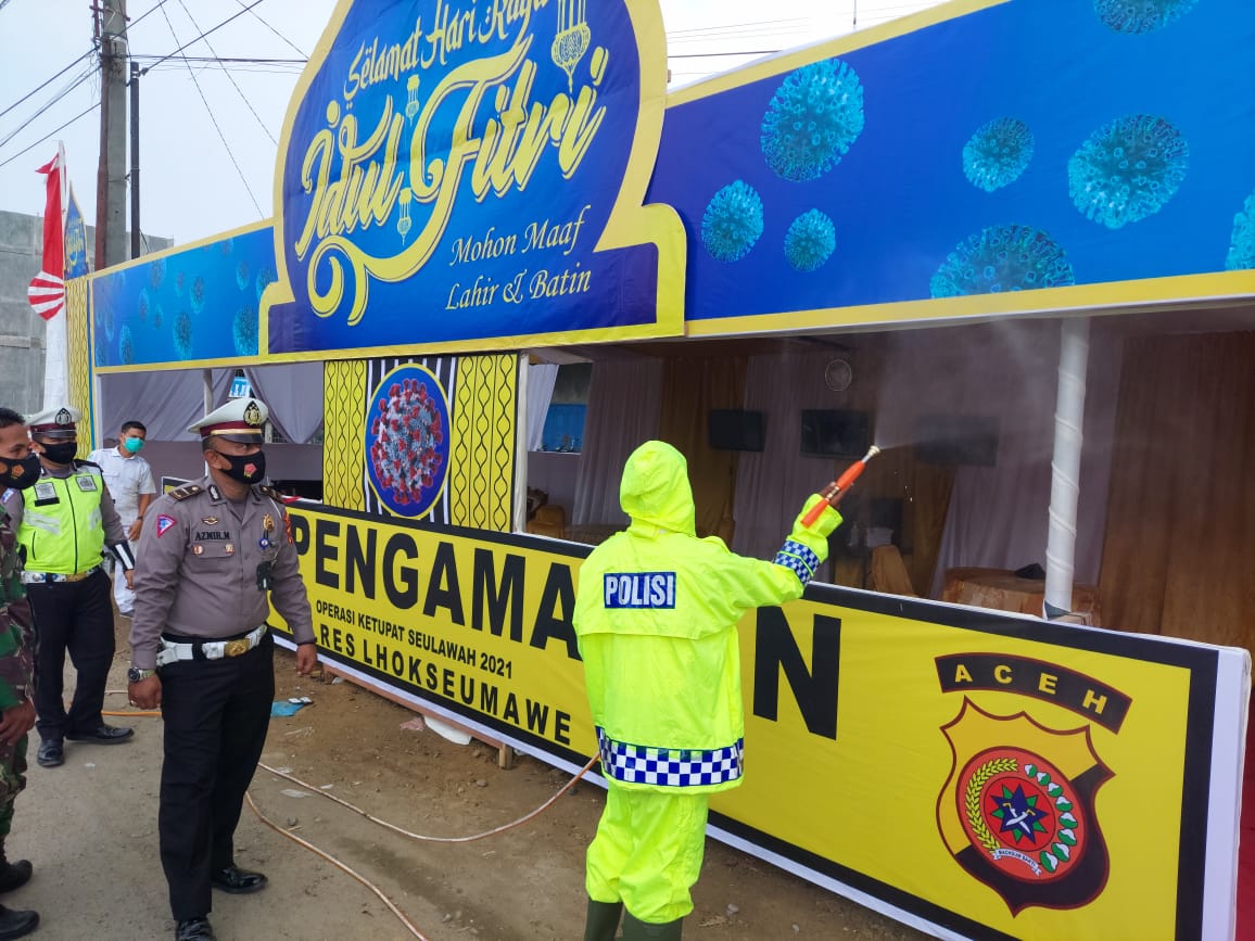LHOKSEUMAWE – Guna mencegah penyebaran Covid-19 di wilayah hukum Polres Lhokseumawe, personel Sat Lantas melaksakan penyemprotan disinfektan pada tiga pos pengamanan Idul Fitri Ops Ketupat Seulawah, Kamis (6/5/2021).