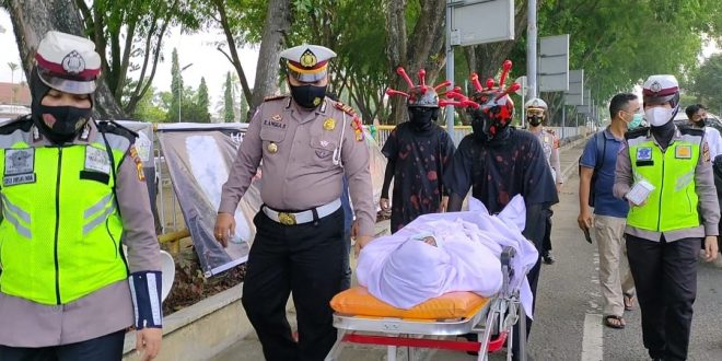 LHOKSEUMAWE – Sosialiasi protokol kesehatan (prokes) yang dilakukan Sat Lantas Polres Lhokseumawe di Simpang Taman Riyadhah mengundang perhatian publik. Pasalnya, dalam kegiatan tersebut personel menghadirkan korban Covid-19 sudah menjadi pocong, Sabtu (29/5/2021).