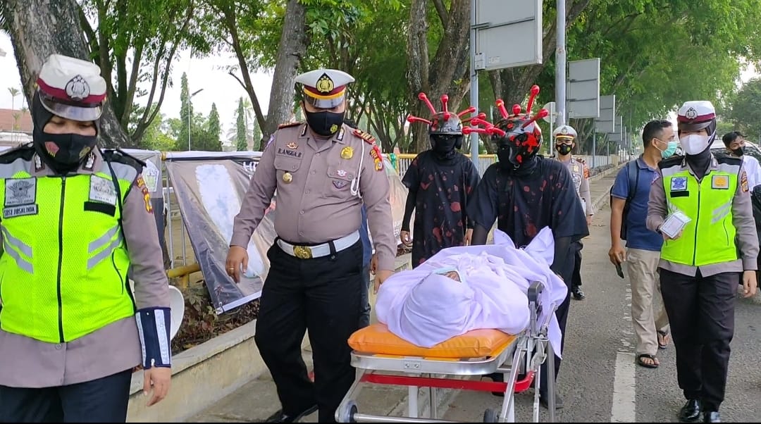 LHOKSEUMAWE – Sosialiasi protokol kesehatan (prokes) yang dilakukan Sat Lantas Polres Lhokseumawe di Simpang Taman Riyadhah mengundang perhatian publik. Pasalnya, dalam kegiatan tersebut personel menghadirkan korban Covid-19 sudah menjadi pocong, Sabtu (29/5/2021).