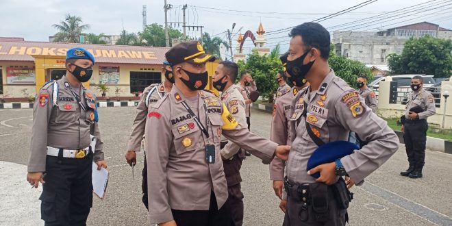 LHOKSEUMAWE – Wakapolres Lhokseumawe Kompol Raja Gunawan didampingi Kasi Propam Iptu Iskandar memeriksa langsung kerapian personel, pemeriksaan tersebut berlangsung di lapangan Apel Mapolres Lhokseumawe, Selasa (18/5/2021) pagi.