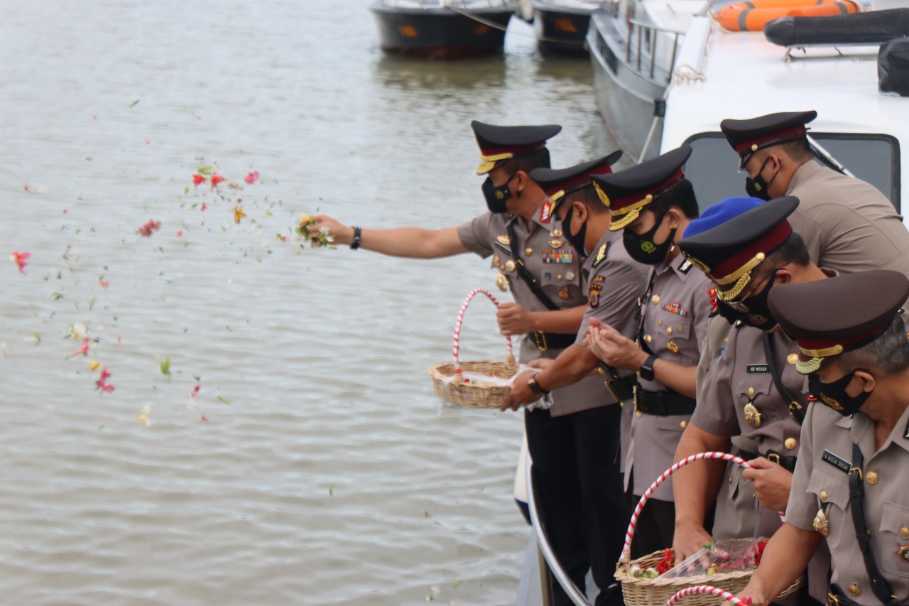 Diketahui, upacara tabur bunga di laut ini merupakan rangkaian kegiatan dalam rangka HUT Bhayangkara ke-75, yang puncaknya akan dilaksanakan pada tanggal 1 Juli mendatang.