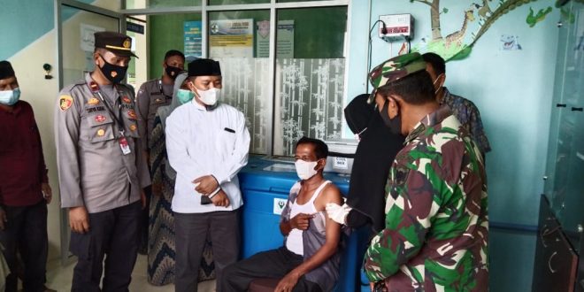 LHOKSEUMAWE – Kapolsek Meurah Mulia, Ipda Sirya Iqbal bersama unsur Muspika memantau langsung pelaksanaan vaksinasi massal di Puskesmas Meurah Mulia, Aceh Utara, wilayah hukum Polres Lhokseumawe, Jumat (4/6/2021).