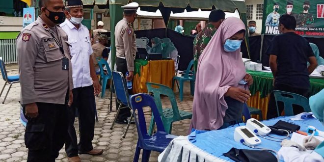 LHOKSEUMAWE – Kapolsek Muara Dua, Ipda Slamet Rezeky memantau langsung pelaksanaan vaksinasi massal di Gampong Alue Awe dan Puskesmas Muara Dua, Kota Lhokseumawe, Rabu (23/6/2021).