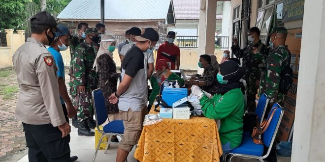 LHOKSEUMAWE – Personel Sub Sektor Gereudong Pase, Polres Lhokseumawe melakukan pengamanan pelaksanaan vaksinasi massal di Puskesmas setempat, Jumat (4/6/2021).