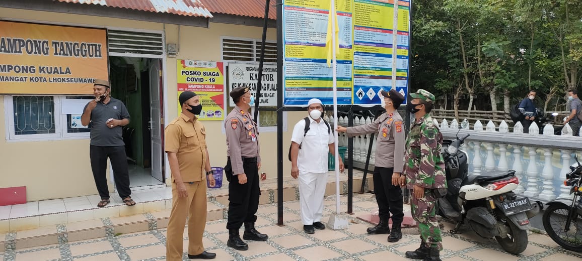 LHOKSEUMAWE – Personel Polres Lhokseumawe didampingi unsur Muspika Blang Mangat melakukan pengecekan kesiapan Pemberlakuan Pembatasan Kegiatan Masyarakat (PPKM) Mikro di Gampong Meunasah Kuala, Kecamatan Blang Mangat, Kota Lhokseumawe, Selasa (8/6/2021).