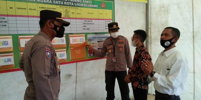 LHOKSEUMAWE – Personel Polres Lhokseumawe didampingi Muspika Muara Satu, Kota Lhokseumawe melakukan pengecekan terhadap posko Pemberlakuan Pembatasan Kegiatan Masyarakat (PPKM) Mikro di Gampong Padang Sakti, Kamis (10/6/2021).