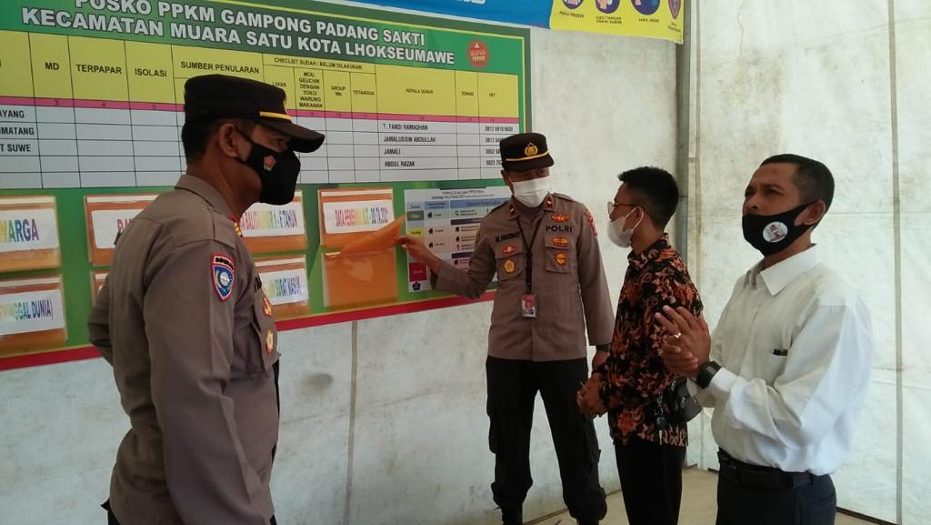 LHOKSEUMAWE – Personel Polres Lhokseumawe didampingi Muspika Muara Satu, Kota Lhokseumawe melakukan pengecekan terhadap posko Pemberlakuan Pembatasan Kegiatan Masyarakat (PPKM) Mikro di Gampong Padang Sakti, Kamis (10/6/2021).