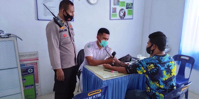 LHOKSEUMAWE – Personel Polsek Kuta Makmur, Polres Lhokseumawe memantau pelaksanaan vaksinasi massal di Puskesmas Kuta Makmur, Kabupaten Aceh Utara, Rabu (9/6/2021). Dalam kegiatan itu, sebanyak 155 masyarakat ikut mendaftar.