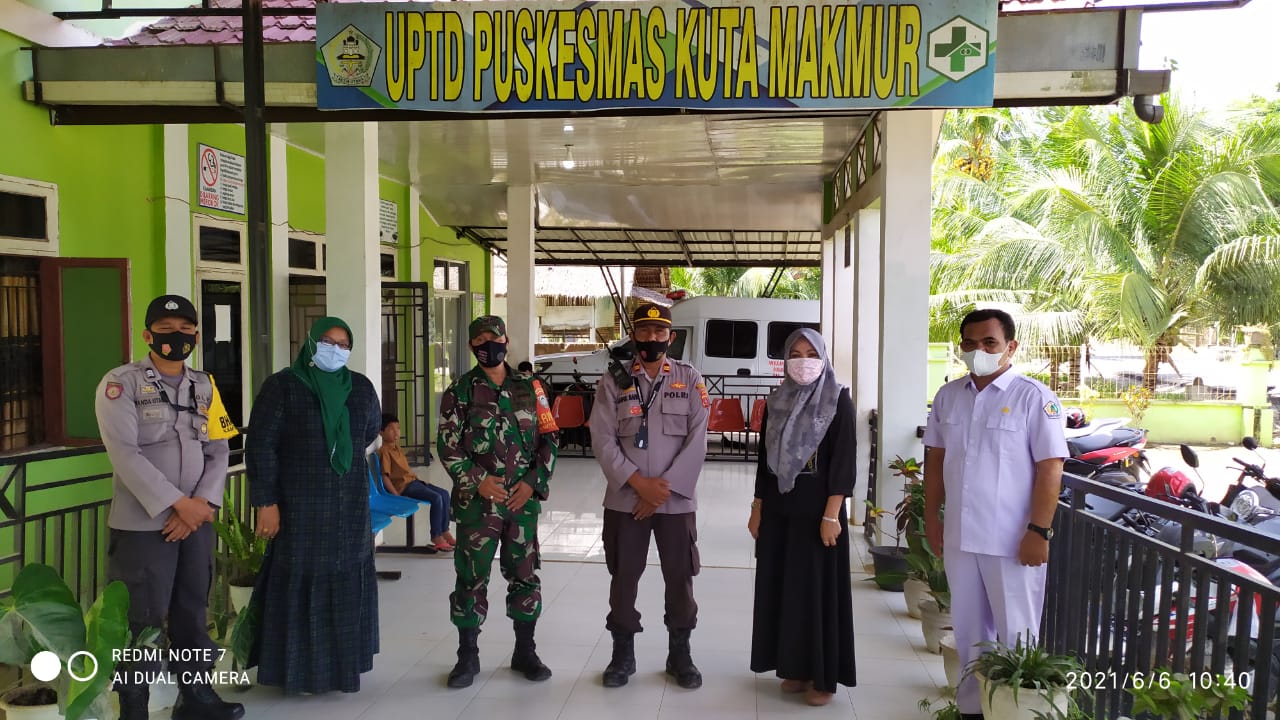 LHOKSEUMAWE – Personel Polsek Kuta Makmur memantau pelaksanaan vaksinasi massal di Puskesmas Kuta Makmur, Aceh Utara, wilayah hukum Polres Lhokseumawe Minggu (6/6/2021).