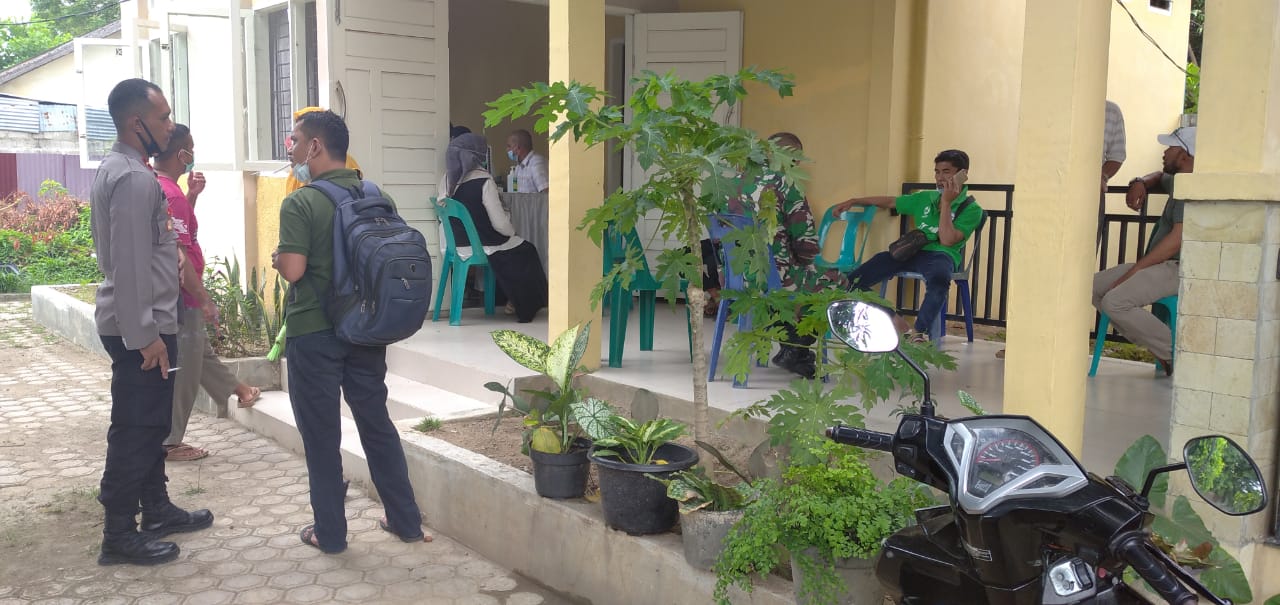 LHOKSEUMAWE – Personel Polsek Muara Batu melakukan pengamanan pada kegiatan vaksinasi massal di Puskesmas Muara Batu, Kabupaten Aceh Utara, Jumat (4/6/2021).