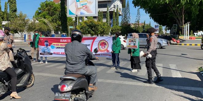 LHOKSEUMAWE – Polres Lhokseumawe bersama mahasiswa KKN Unimal melaksanakan sosialisasi protokol kesehatan (prokes) dan membagikan masker kepada para pengendara, kegiatan tersebut berlangsung di Jalan Merdeka, Simpang Taman Ryadhah, Kecamatan Banda Sakti, Kota Lhokseumawe, Selasa (22/6/2021).