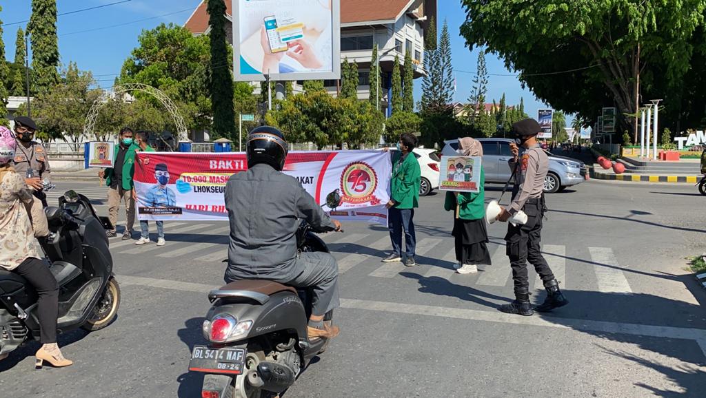 LHOKSEUMAWE – Polres Lhokseumawe bersama mahasiswa KKN Unimal melaksanakan sosialisasi protokol kesehatan (prokes) dan membagikan masker kepada para pengendara, kegiatan tersebut berlangsung di Jalan Merdeka, Simpang Taman Ryadhah, Kecamatan Banda Sakti, Kota Lhokseumawe, Selasa (22/6/2021).