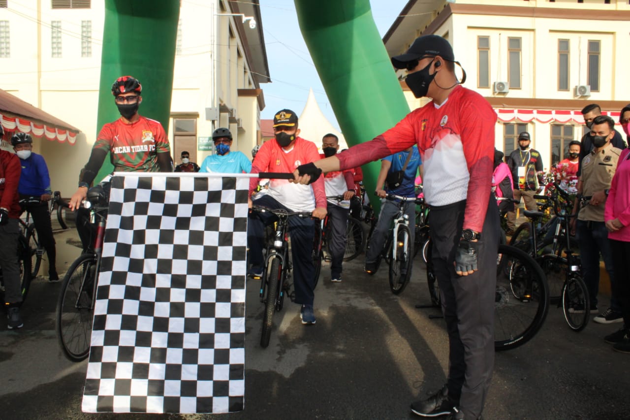 LHOKSEUMAWE – Polres Lhokseumawe menggelar Gowes Ceria yang diikuti oleh ratusan Goweser dari TNI-Polri, ASN dan sejumah Bhayangkari Polres Lhokseumawe. Gowes Ceria tersebut merupakan salah satu rangkaian menyambut hari Bhayangkara ke 75, Jumat (25/6/2021) pagi.
