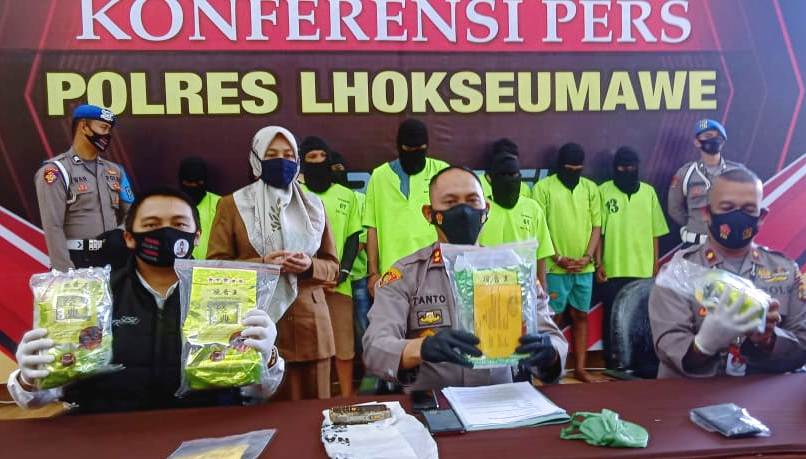 Kapolres Lhokseumawe AKBP Eko Hartanto SIK MH dalam konferensi pers yang berlangsung di gedung serbaguna Mapolres Lhokseumawe mengatakan, semua barang bukti tersebut diamankan dalam empat laporan polisi (LP). Selain itu, Satresnarkoba Polres Lhokseumawe juga menangkap 10 tersangka.
