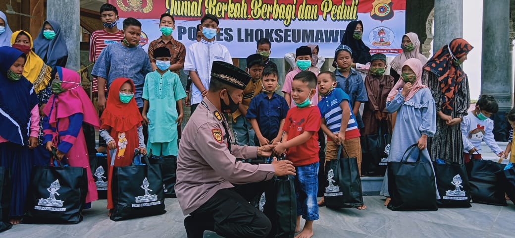 LHOKSEUMAWE – Polres Lhokseumawe meluncurkan program Jum’at Berkah Berbagi dan Peduli kepada anak yatim piatu di wilayah hukum Polres Lhokseumawe.