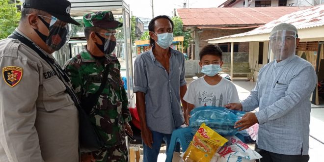 LHOKSEUMAWE – Polres Lhokseumawe menyerahkan bantuan sembilan bahan pokok (sembako) kepada keluarga pasien yang positif Covid-19 di Gampong Jawa Baru, Kecamatan Banda Sakti, Kota Lhokseumawe, Rabu (9/6/2021).