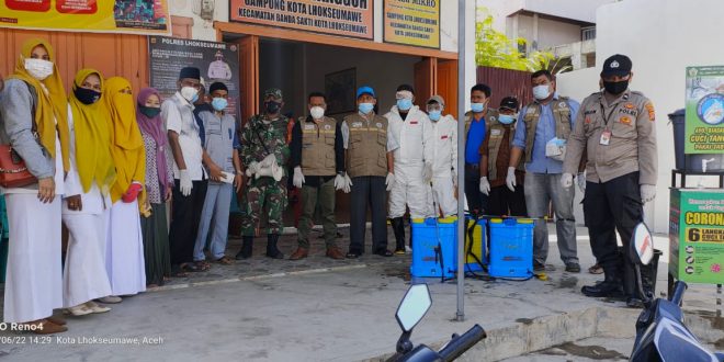 LHOKSEUMAWE – Polsek Banda Sakti, Polres Lhokseumawe melakukan penyemprotan disinfektan di Gampong Meunasah Kota, Kecamatan Banda Sakti, Kota Lhokseumawe, Selasa (22/6/2021).